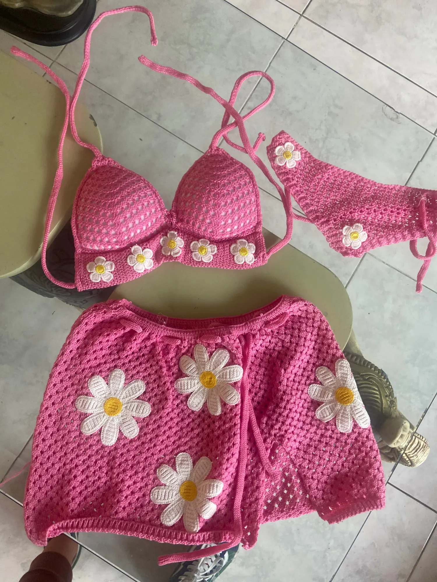 The ✨ Dreamofthe90s Flower Power Knitted Two Piece Set ✨ is made with top-notch polyester, viscose, and cotton blend materials. 😍 It features a halter top 🔝 with a lace closure and a 🌺 floral design, paired with an above-the-knee 🌸 mini skirt 🌴 with a drawstring closure and floral design. 👌 Perfect for summer! ☀️