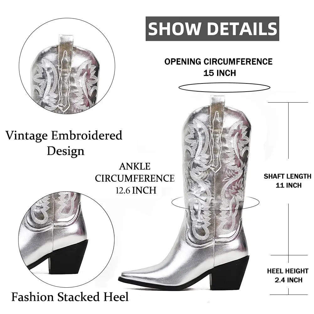 Step into the style of the 90s with these Metallic Mid Calf Cowgirl Boots from Dreamofthe90s! Made with microfiber material and rubber outsoles, these boots are perfect for slipping on during spring and autumn. With stacked heels and an embroidered fashion element, they'll add a kick to any outfit. Plus, the pointed toe and mid-calf length give off some serious Roman vibes.