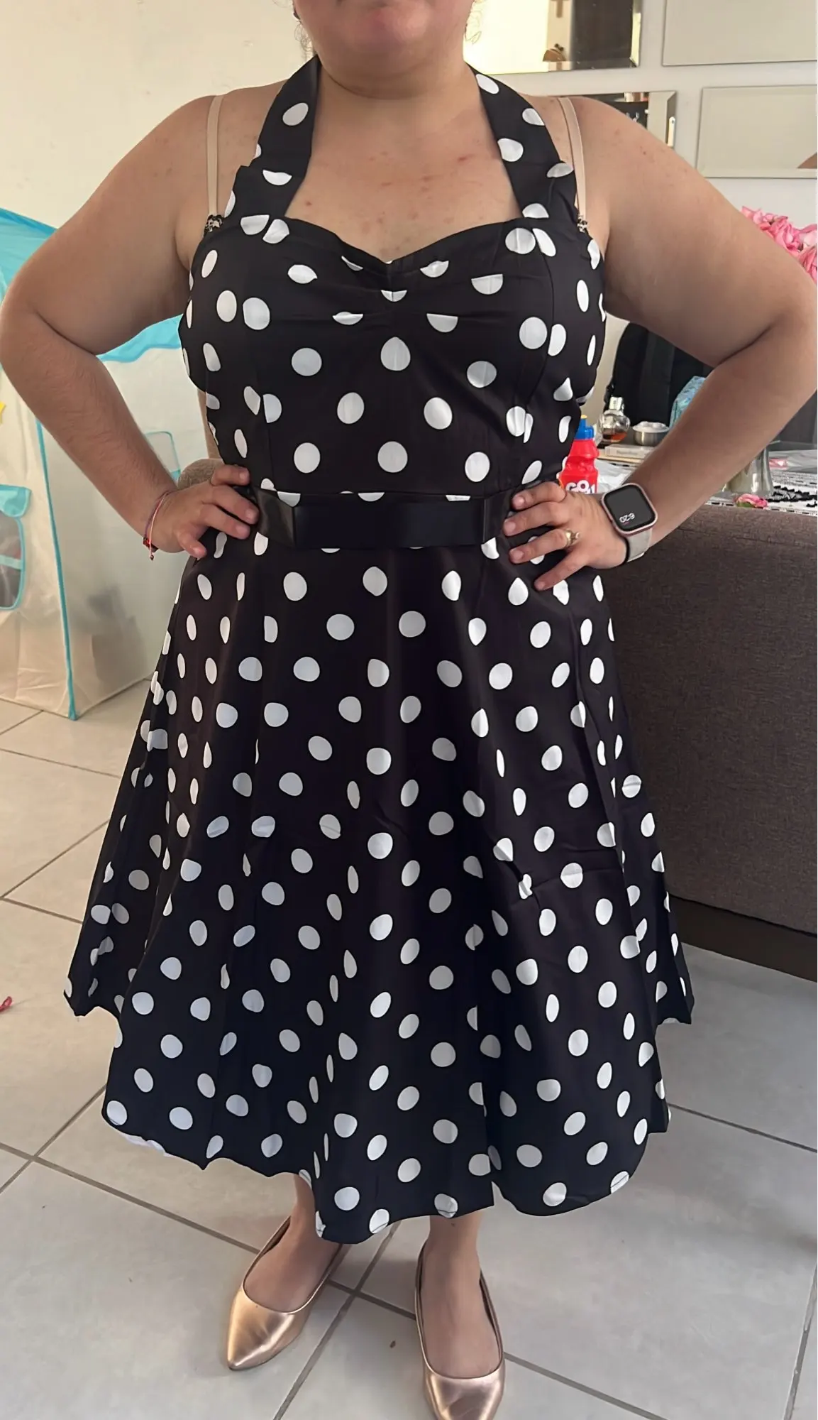 This Dreamofthe90s Polka Dot Rockabilly Dress boasts an empire waist, knee-length party style with a sleeveless cut, halter neckline, and zipper closure. The slight stretch and bow adornment add a playful touch to the classic polka dot print, making it ideal for pin-up looks and theme parties!