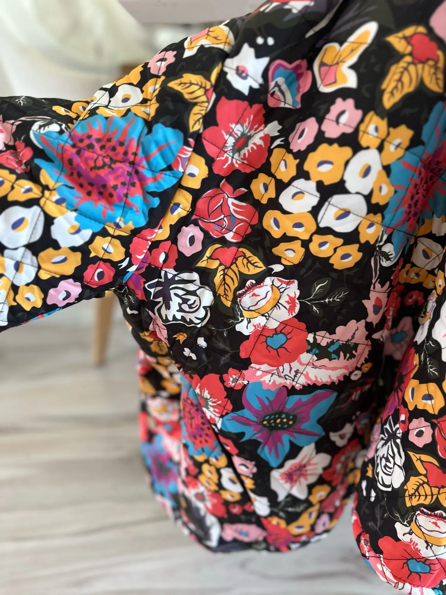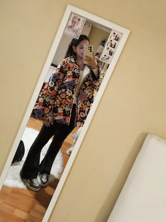 Our women's Quilted Jacket exudes a gorgeous floral motif and a charming quilted design, complete with an o-neck collar for a touch of vintage flair.