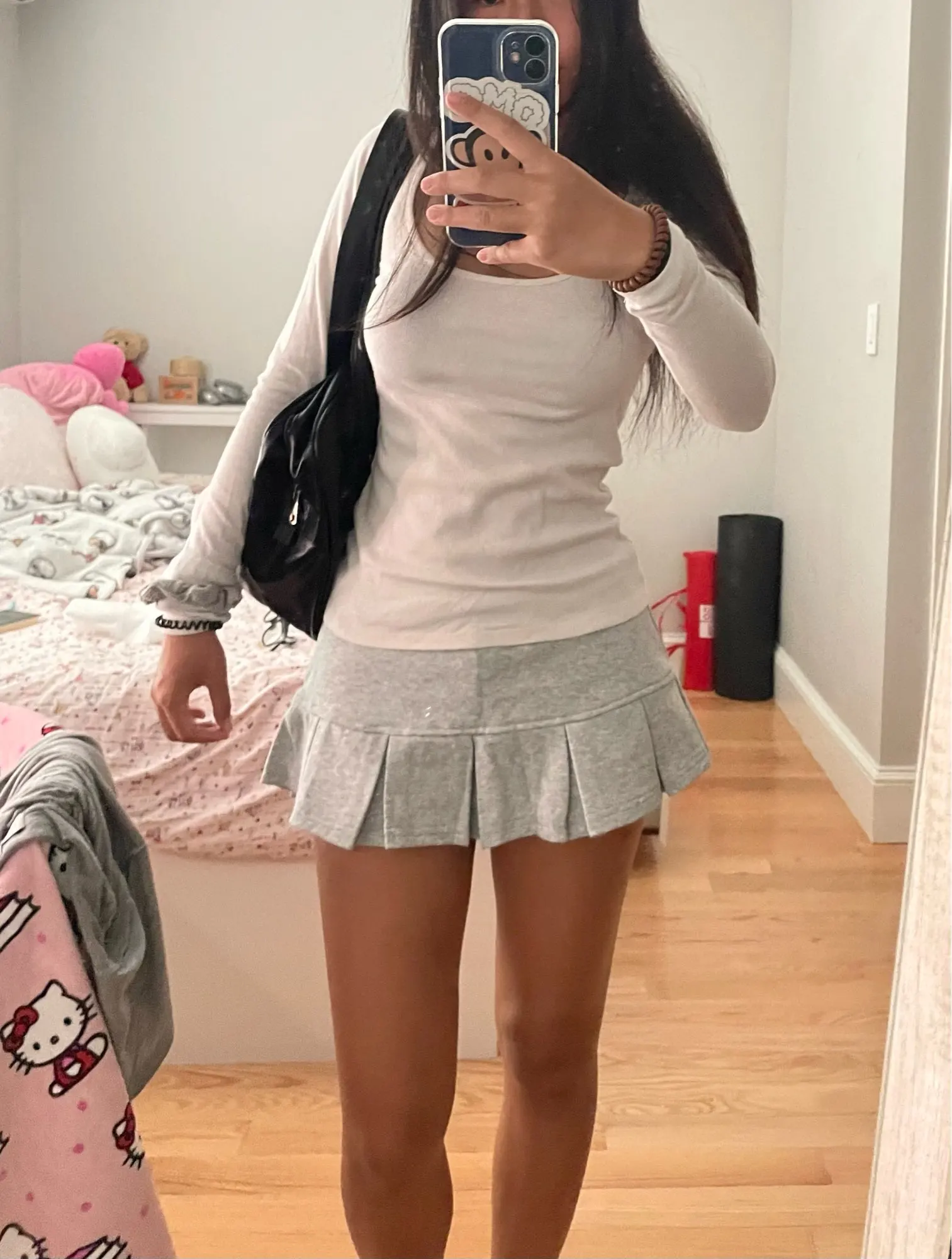 Indulge in the whimsical and eccentric feels with our Y2K Pleated Terry Miniskirt - the ultimate fusion of flexibility, excellence, and fashion. Crafted with an empire waistline, slim cut, and pleats just above the knee, this skirt is available in black, white, and grey.